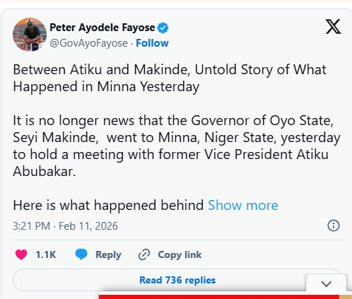Fayose’s statement, titled “Between Atiku and Makinde, Untold Story of What Happened in Minna,” was shared on his verified X account and discussed a closed-door gathering involving Makinde and Atiku.